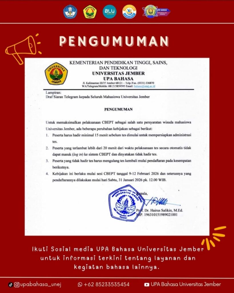 Kepala UPA Bahasa, Prof. Hairus Sailikin, M.Ed. dalam sambutannya saat penutupan final lomba menyampaikan bahwa lomba ini direncanakan akan dilaksanakan setiap tahun. “Karena itu, kepada para guru dan pendamping, silakan siapkan sejak dini untuk mengikuti lomba berikutnya,” kata Guru Besar FIB Unej ini.