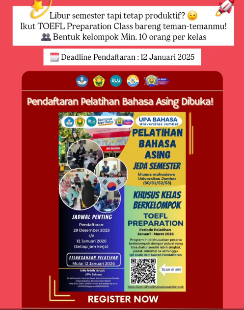 Dua siswi SMA Negeri 1 Jember, Lialen Mae Patricia Cerado dan Shareefa Khadeeja Djoulaikha Al Hayyina, berhasil meraih Juara 1 dan 2 dalam Lomba Pidato Bahasa Inggris (English Speech Contest) tingkat nasional bagi pelajar SMA/SMK/MA dan yang sederajat. Patricia dan Shareefa dinobatkan oleh juri sebagai Juara 1 dan 2 lomba tersebut setelah berhasil mengungguli peserta lainnya dengan nilai 285 dan 281. Prestasi ini berhasil diraih setelah Patricia dan Shareefa tampil memukau saat menyampaikan pidato dan menjawab pertanyaan juri. Di bawah mereka, Ainiya Rubaya Sakhi dari SMA Ibrahimy 2 Sukorejo, Situbondo, berhasil menduduki Juara 3 dengan nilai 260. Final lomba ini disiarkan secara langsung (live) melalui kanal Youtube UPA Bahasa Universitas Jember. Selengkapnya dapat dilihat pada tautan ini: https://unej.id/livelombapidatobinggsris2024.